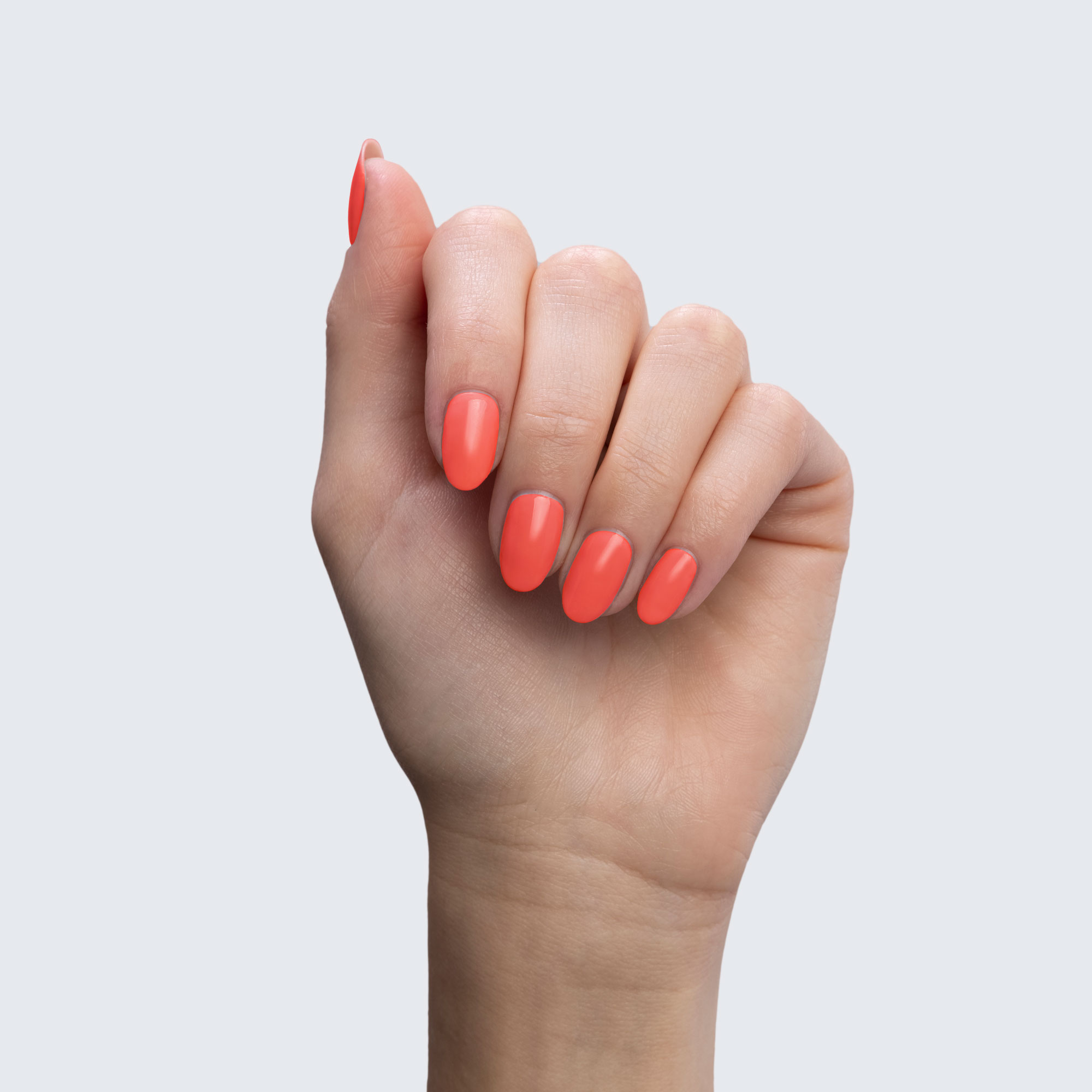 Neon pink-red. Medium. Bright. Opaque. Warm undertone.